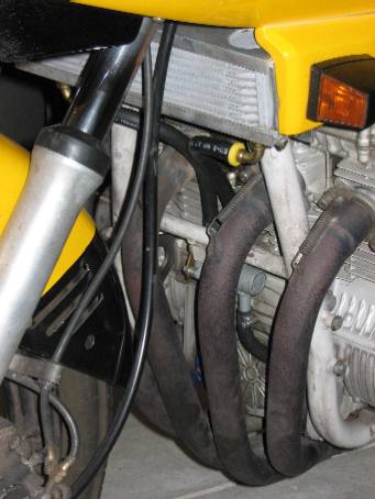 Well here's how I ended up installing the cooler, thermostat, brackets, hoses, etc. When I first got the bike, the cooler was mounted about 2" lower. But when I installed the thermostat, I took the opportunity to trim a few mm off the ends of the cooler brackets, so that it could properly fit into the oil-cooler bay. Now it's all where it should be: the cooler sits squarely in the air-flow, and the hoses still allow free access to the oil filter.