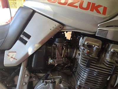 This project has been 2 1/2 years in the making. Anyway, what I was planning was to add 1988 GSX-R 750 carburetors, the oval ones, I just did not want to add the pods as it would look like it was a 'highly' modified Kat. I wanted to keep the stock appearance as much as possible, so I had to find a way to adapt the stock plenum and filter to these carbies, and thus also not having the problems when pods are used.
