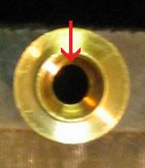 As I mentioned above, the needle jets on the GSX-R 'Slingshot' carbies are prone to wear. Very prone, in fact. With the needle sliding up and down on one side of the jet (they are 'biased' this way, to prevent the needle rattling around and causing fuel atomisation problems), it's only a matter of time until the orifice is worn, and allows too much fuel through, making your mid-range too rich. This is what it looks like: