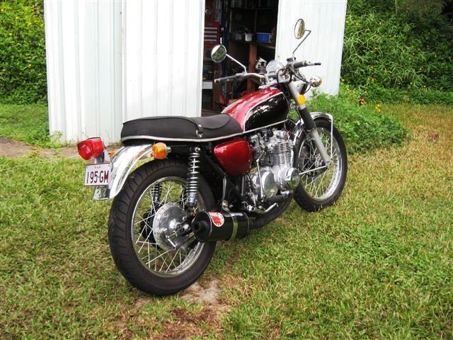 Further to your building a muffler, I also have done a similar thing, although i was given an empty 'Tranzac' megaphone. Again it was for a Honda from the early 70s this time a 550 four but I needed to make a decent baffle. I bought the already-perforated pipe though; not cheap @ $60 bucks per meter. So I bought half a meter, and at work we have a plasma cutter and a MIG. I found a drive pulley from an old truck water pump, and ground off the vee-belt drive ring. Then I used a new bed spring begged from a mattress factory to keep pressure on the assembled baffle.