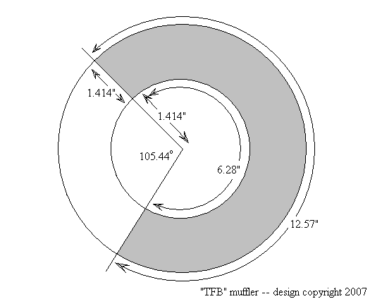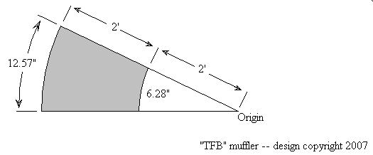 Then I had to dust off some High School mathematics in order to draw the flat shapes required for the two truncated cones that were going to make up the outer surface of the muffler. This sounds a bit complicated, but it's actually not too difficult. [If you want different sized cones to the ones specified on this webpage, just hop onto Google and search for 'truncated cone formula', and you'll be able to figure it out for yourself.] Anyway, here's the shape for the long cone (diagram not to scale):