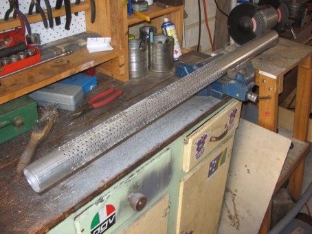 I managed to track down some aluminium mesh which can be rolled in three sections to form the silencer material, instead of the dreaded fibreglass. This gives it an awesome throaty note and should last virtually forever.
